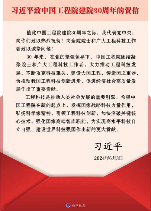 習(xí)近平在賀信中指出,30年來,在黨的堅強領(lǐng)導(dǎo)下,中國工程院團結(jié)凝聚院士和廣大工程科技工作者,大力推動工程科技發(fā)展,不斷攻克科技難關(guān),建設(shè)大國工程,鑄造國之重器,為推動我國工程科技創(chuàng)新進步、促進經(jīng)濟社會高質(zhì)量發(fā)展作出了重要貢獻。